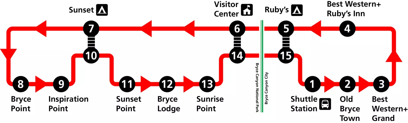 The shuttle runs a single, counter-clockwise loop through the Bryce Amphitheater area, stopping at major interest points including: